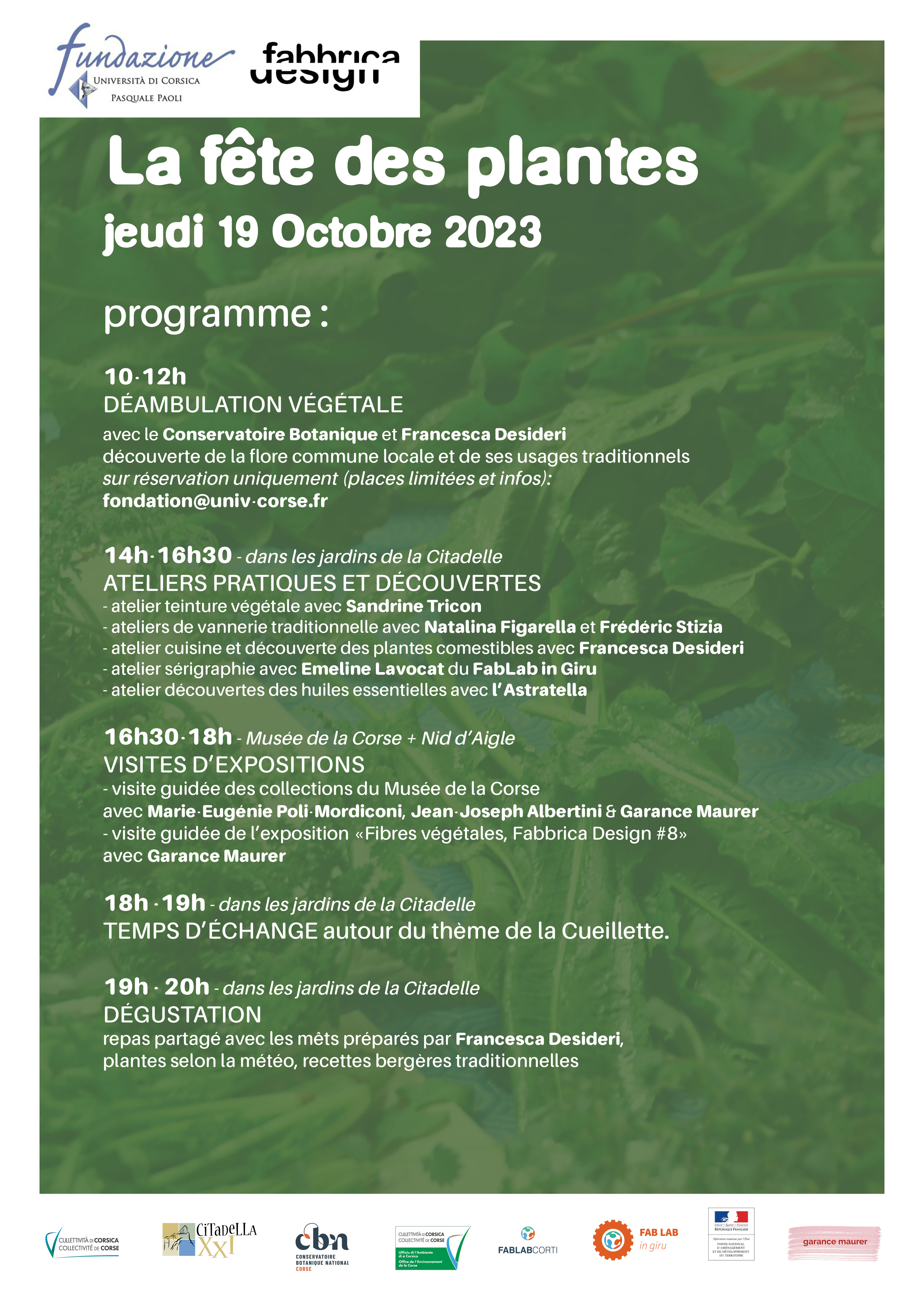 Jeudi 19 Octobre à partir de 10h Jardins de la Citadelle - Corti Le 19 octobre 2023, la Fondation de l’Université de Corse en partenariat avec la Direction du Patrimoine de la Collectivité de Corse et le Conservatoire Botanique National de Corse organise une journée de découvertes et d’échanges autour des végétaux dans la Citadelle de Corti. Garance Maurer, lauréate et designer en résidence de Fabbrica Design sur les fibres végétales en 2022, proposera de poursuivre ses recherches initiées sur le territoire corse. La Fête des Plantes vous fera plonger dans le processus de recherche que Garance avait développé en 2022 : à la rencontre des sentiers, des végétaux et des acteurs et actrices du territoire. Une journée pour tisser des liens, pour découvrir une sélection de plantes locales et leurs usages : de la vannerie à la teinture, de la nourriture aux soins, plusieurs ateliers participatifs se dérouleront dans les jardins de la Citadelle à Corte durant l’après-midi. Visitez les différents stands animés par des artisans et artistes avec qui Garance avait collaborés comme Natalina Figarella et Frédéric Sitzia (vannerie), Sandrine Tricon (teinture), L’Astratella (huiles essentielles), Francesca Desideri (cuisine) et Emeline Lavocat (FabLab in Giru - sérigraphie). Des visites guidées des collections permanentes du musée de la Corse et de l’exposition « Fibres Végétales, Fabbrica Design » vous plongeront dans les richesses artisanales et artistiques des fibres végétales. La journée s’ouvrira sur une déambulation végétale guidée par le Conservatoire Botanique National de Corse et Francesca Desideri, pour découvrir et identifier les plantes communes et leurs usages traditionnels en Corse (activité sur inscription - places limitées). Elle se clôturera dans les Jardins de la Citadelle avec une dégustation de recettes traditionnelles proposées par Francesca Desideri. Plus d'infos en téléchargement ou sur le site. |