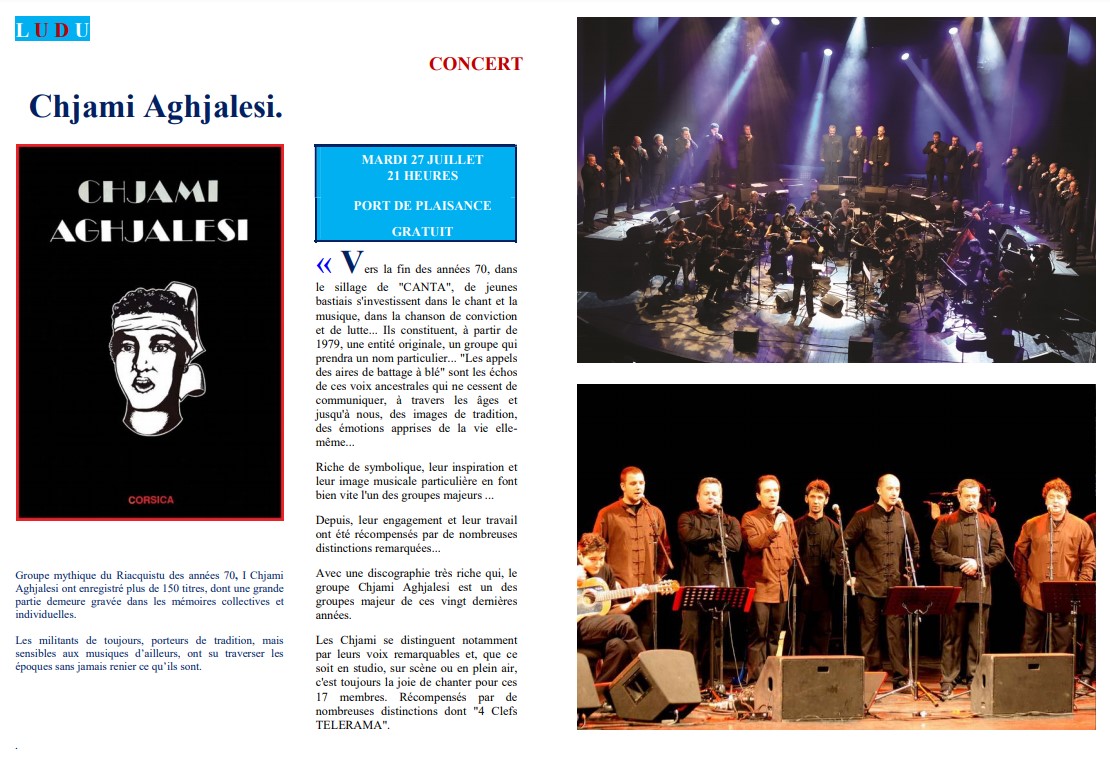 Mardi 27 Juillet - 21H Port de plaisance - Propriano Concert gratuit. Plus d'infos sur le site et en téléchargement. |