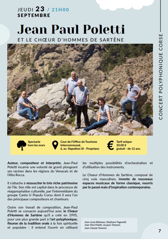 Jeudi 23 septembre - 21h Cour de l’Office de Tourisme de Propriano Plus d'infos en téléchargement. |