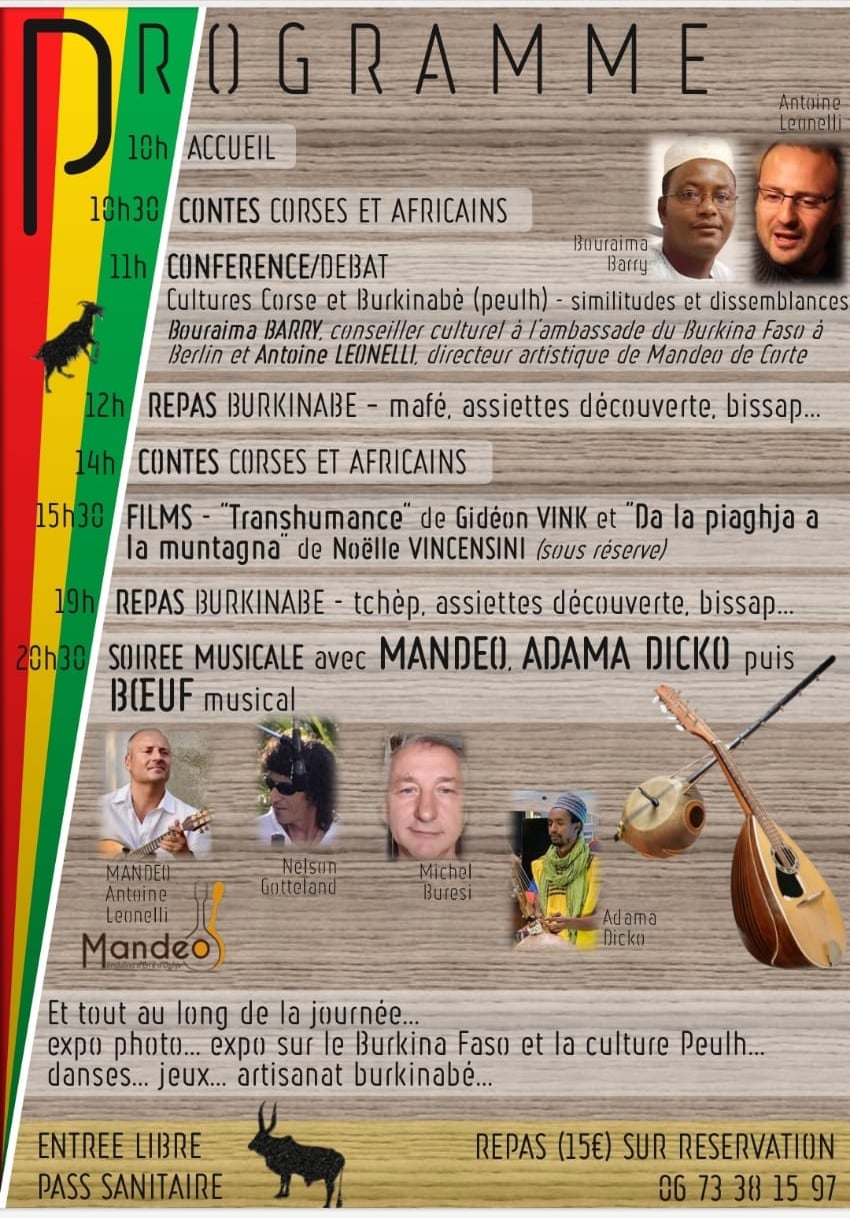 Samedi 25 Septembre Soveria Contes corses et africains Films documentaires Soirée musicale Repas burkinabès du midi et du soir ** sur réservation 15 euros ** 06 73 38 15 97 Parking limité, covoiturage à favoriser Découvrez le programme en téléchargement. |