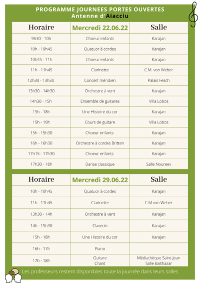 Les mercredis 22 et 29 juin 2022, de 9h30 à 18h, venez découvrir le Conservatoire de Corse Henri Tomasi à l’occasion de ses Journées Portes Ouvertes ! Découvertes instrumentales, mini-concert, échanges avec les professeurs... Venez nous rencontrer ! Plus d’infos en téléchargement et sur le site. |