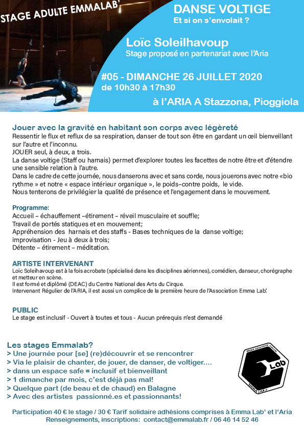 Nous sommes très heureux de vous annoncer le stage tant attendu de danse voltige avec le circassien Loïc Soleilhavoup. RENDEZ VOUS DIMANCHE 26 juillet à 10h30 à l'ARIA, A Stazzona à Pioggiola (Haute Balagne) Ce stage est réservé aux adultes ou adolescents à partir de 16 ans. L'inscription inclue l'adhésion à l'association l'ARIA et à Emma Lab pour les non adhérents. Programme en téléchargement. |