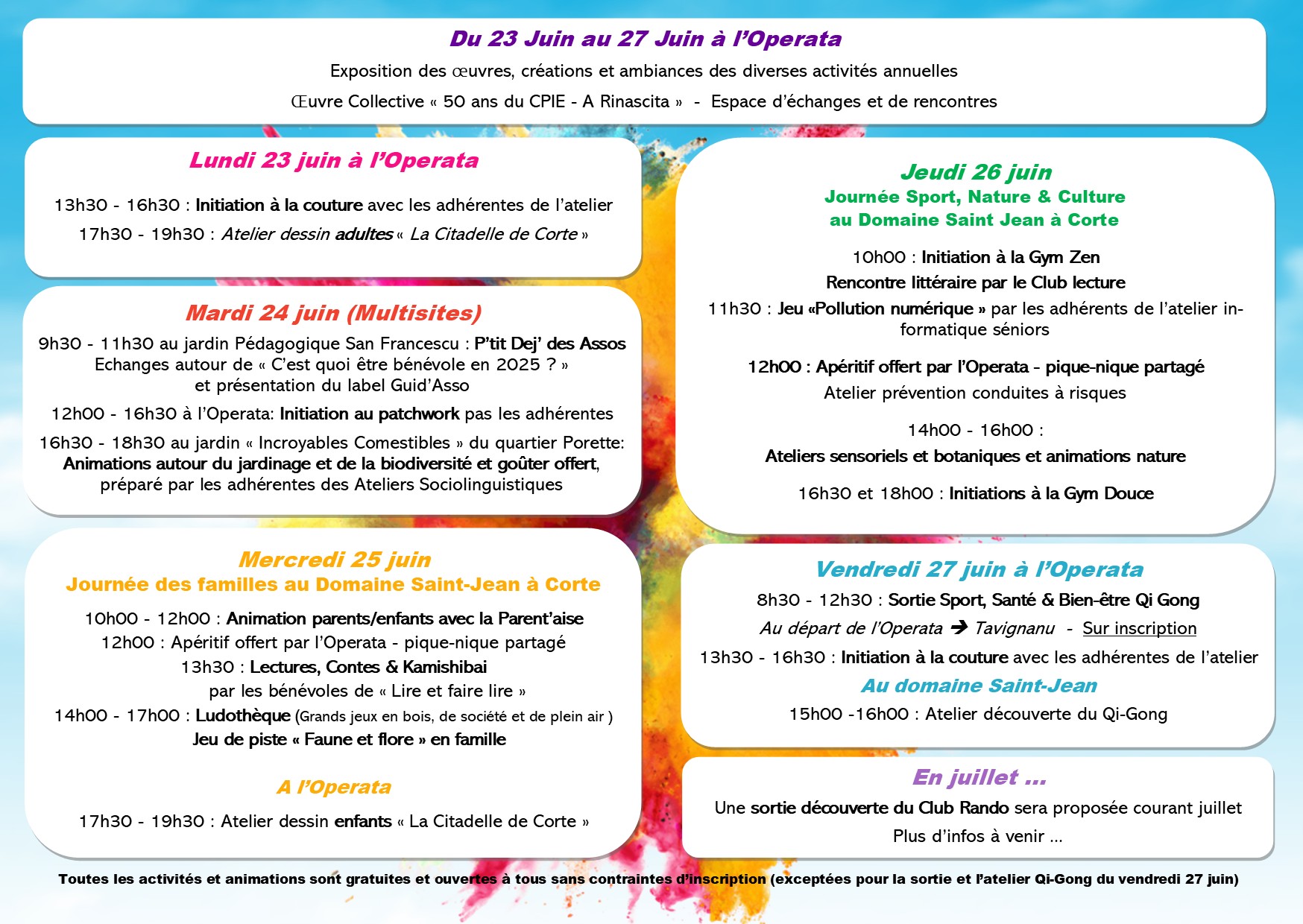 Du lundi 23 juin au vendredi 27 juin CPIE A Rinascita - Corti INITIATIONS AUX ATELIERS - ECHANGES - JEUX - RENCONTRES - ANIMATIONS - EXPOSITIONS Programmation en téléchargement Gratuit - ouvert à tous Plus d'infos sur le site ou part téléphone. |