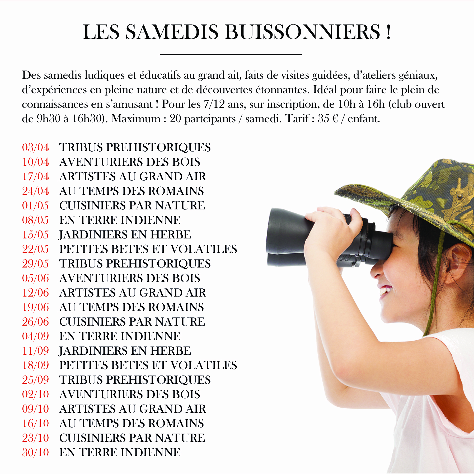 04/09 - En terre indienne 10H - 16H Des samedis ludiques et éducatifs au grand air, faits de visites guidées, d'ateliers géniaux, d'expériences en pleine nature et de découvertes étonnantes. Idéal pour faire le plein de connaissances en s'amusant ! Pour les 7/12 ans, sur inscription, de 10h 16h (Club ouvert de 9h30 à 16h30) Maximum : 20 participants / samedi Tarif 35 euros / enfant Retrouvez les différents thèmes des Samedis buissonniers en téléchargement. Infos / inscriptions sur le site. |