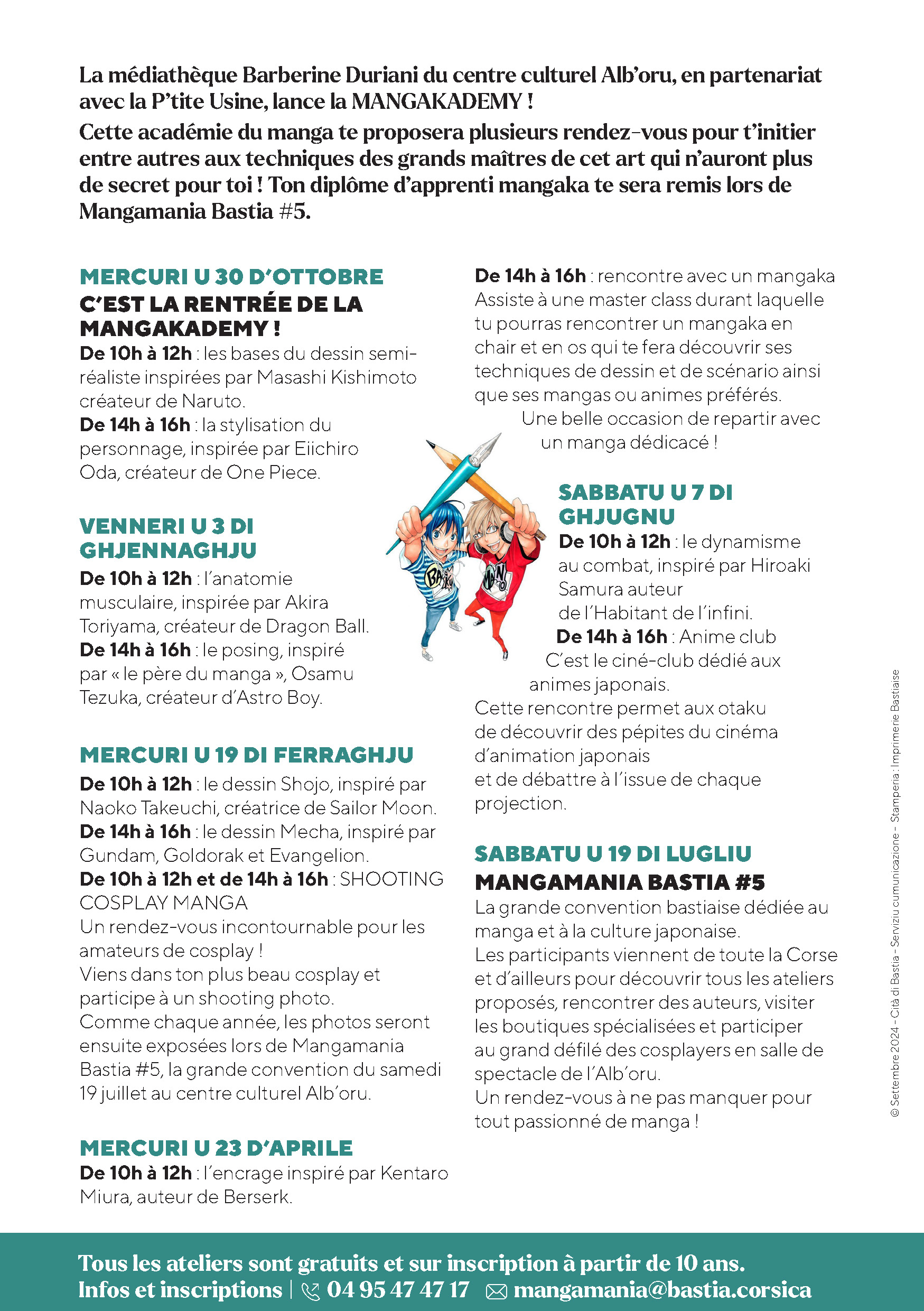 Mercredi 23 avril à partir de 10h Médiathèque Barberine Duriani - Bastia La médiathèque Barberine Duriani du centre culturel Alb'oru, en partenariat avec la P'tite Usine, lance la MANGAKADEMY! Cette académie du manga te proposera plusieurs rendez-vous pour t'initier entre autres aux techniques des grands maîtres de cet art qui n'auront plus de secret pour toi! Ton diplôme d'apprenti mangaka te sera remis lors de Mangamania Bastia #5. De 10h à 12h: l'encrage inspiré par Kentaro Miura, auteur de Berserk De 14h à 16h rencontre avec un mangaka Assiste à une master class durant laquelle tu pourras rencontrer un mangaka en chair et en os qui te fera découvrir ses techniques de dessin et de scénario ainsi que ses mangas ou animés préférés une belle occasion de repartir avec un manga dédicacé! Tous les ateliers sont gratuits et sur inscription à partir de 10 ans. Infos et inscriptions |04 95 47 47 17 mangamania@bastia.corsica Plus d'infos sur le site ou en téléchargement. |