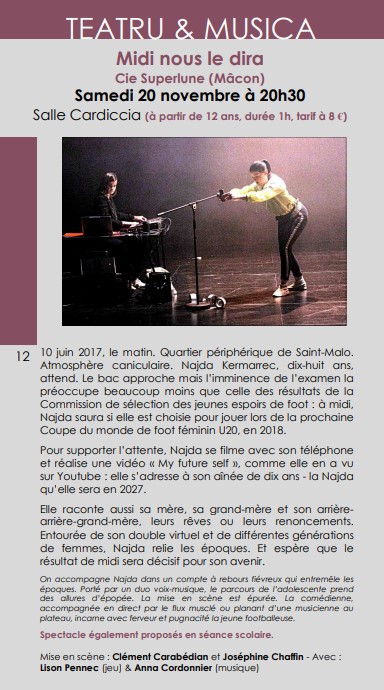 Samedi 20 novembre à 20h30 Salle Cardiccia - Prunelli di Fium'Orbu À partir de 12 ans Durée 1h Tarif à 8 € Plus d'infos en téléchargement et sur le site. |