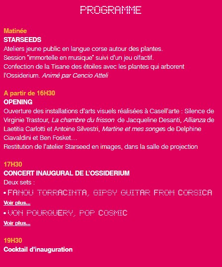 Activation de l'ossiderium / Concerts / Installations... Vendredi 1er Octobre A Fabbrica culturale CASELL'ARTE - Venaco La Fabbrica Culturale Casell’arte inaugure l’Ossiderium le 1er octobre prochain. A cette occasion, l’association située à Venaco (Hôtel E Caselle) propose une programmation artistique toute la journée : ateliers jeunes publics en langue corse, découverte des installations d’arts visuels et concert exceptionnel pour activer officiellement ce nouvel espace de création, conçu par le studio de design Diplomates. A l’intersection de l’art, de l’architecture, et de la performance, l’Ossiderium est composé d’une chambre acoustique et d’une structure d’assise à 5 faces. Chacune de ces faces lie le public à une partie différente du territoire. Un espace de perception et d’observation ouvert à tous au coeur du projet Casell’arte, mêlant son, nature environnante et observation du cosmos. Afin de concrétiser et développer ce qui est devenu l’Ossiderium, Casell’arte a mobilisé l’imaginaire du projet « Désidération », œuvre-monde collective et indisciplinaire initiée par l’artiste SMITH dès 2017, à travers la commission d’un ensemble de microarchitectures du studio Diplomates qui a ainsi conçu et développé l’Ossiderium, auquel se sont associés ensuite le Fab Lab - Pôle innovation et développement de l’Université de Corse (conception de la maquette), les Charpentiers de la Corse (étude et construction) et l’École d’Ingénieurs Paoli Tech - Université de Corse (recherches acoustiques sur site et sur la maquette). A l’image de la Fabbrica Culturale, le projet rassemble une pluralité de regards et de compétences. Programme en téléchargement. Plus d'infos sur le site. |