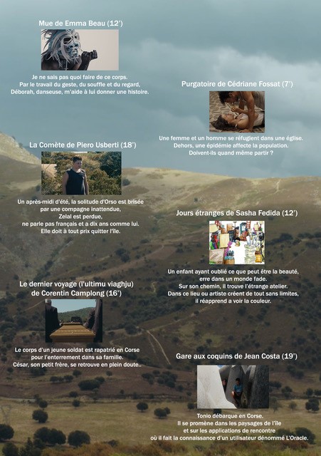 Lundi 20 septembre - 18h30 Cinéma ALBA - Corte • Mue de Emma Beau • Purgatoire de Cédriane Fossat • La Comète de Piero Usberti • Jours étranges de Sasha Fedida • L’ultimu viaghju de Corentin Camplong • Gare aux coquins de Jean Costa Plus d'infos en téléchargement. |