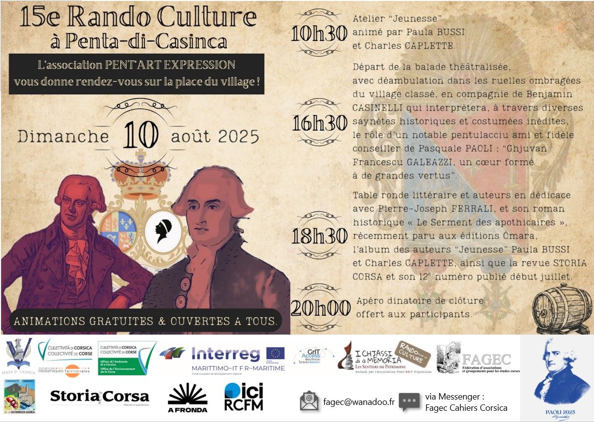 Dimanche 10 août à 16h30 Place - A Penta di Casinca Lorsque Pasquale Paoli part pour son premier exil, Giovan Francesco Galeazzi n'a que 12 ans. Il le rencontre et se lie irrémédiablement à lui à son retour en Corse, alors qu'il est rapatrié par la Révolution Française en 1789. 1793 est également une date importante car c'est celle de la rupture avec la Convention. Puis c'est le Royaume Anglo Corse, de 1794 à 1796. Galeazzi en est des artisans. Il sera toujours fidèle à Paoli. Découvrez le programme en téléchargement. Plus d'infos sur le site ou par téléphone. |