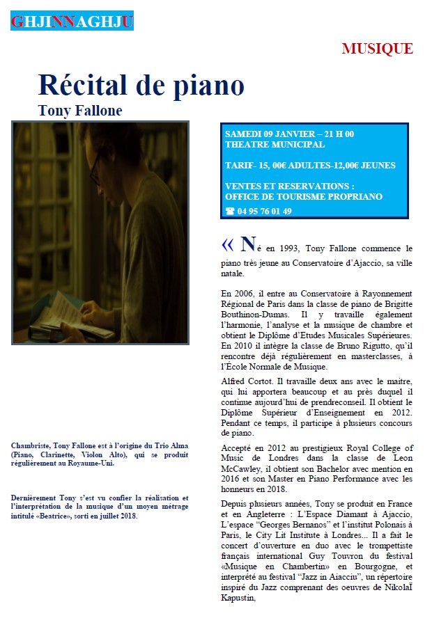 Samedi 9 Janvier - 21H Théâtre de Propriano Chambriste, Tony Fallone est à l’origine du Trio Alma (Piano, Clarinette, Violon Alto), qui se produit régulièrement au Royaume-Uni. Dernièrement Tony s’est vu confier la réalisation et l’interprétation de la musique d’un moyen métrage intitulé «Beatrice», sorti en juillet 2018. Tarifs Adultes : 15€ Jeunes : 12€ Ventes et réservations : Office du tourisme de Propriano Plus d'infos sur le site et en téléchargement. |