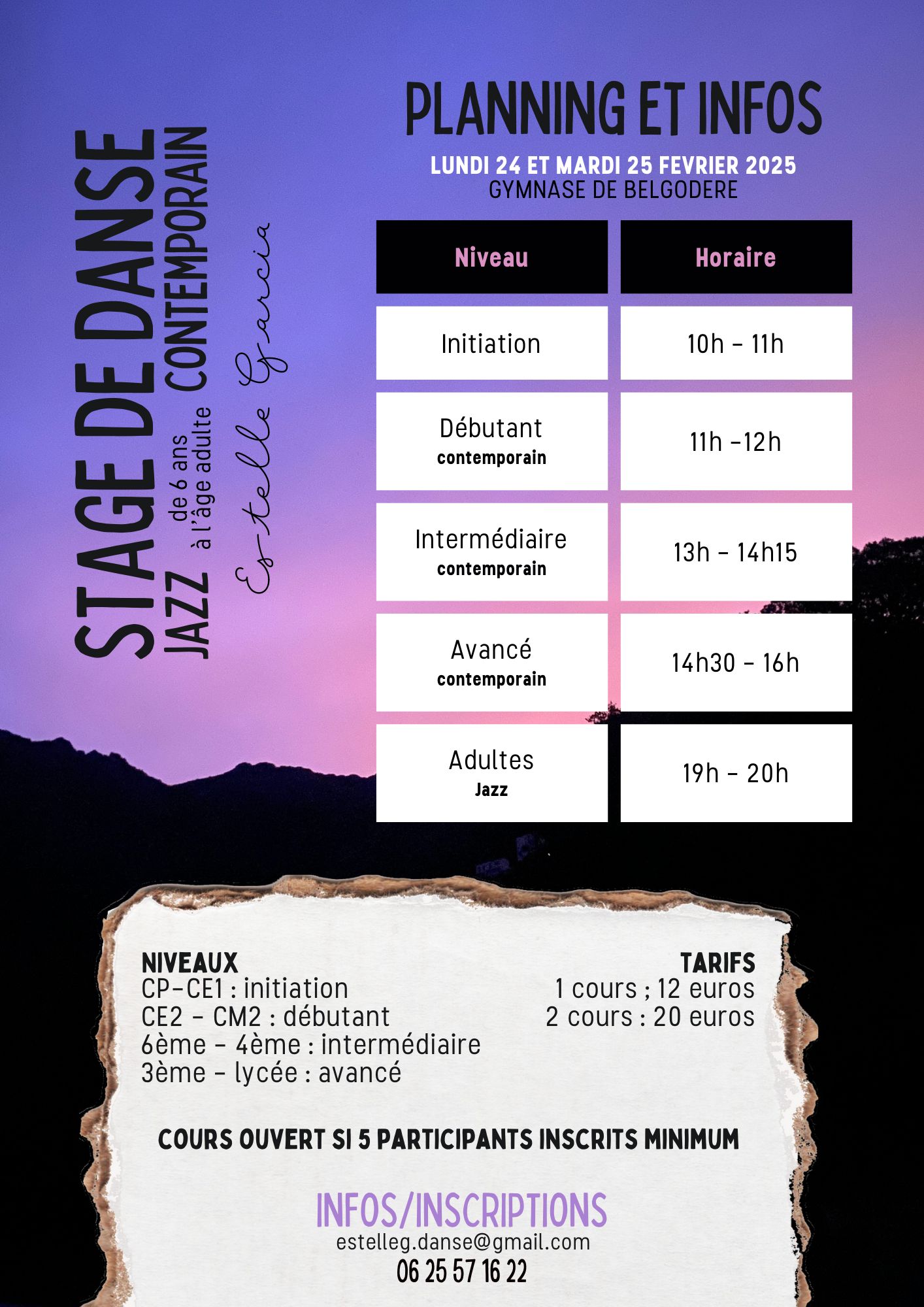 Lundi 24 et mardi 25 février Gymnase - Belgudè De 6 ans à l'age adulte - Avec Estelle Garcia, Professeur de danse D.E Jazz et Contemporain DNSPD Contemporain INFOS/INSCRIPTIONS estelleg.danse@gmail.com 06 25 57 16 22 Planning en téléchargement. Plus d'infos sur le site ou par téléphone. |