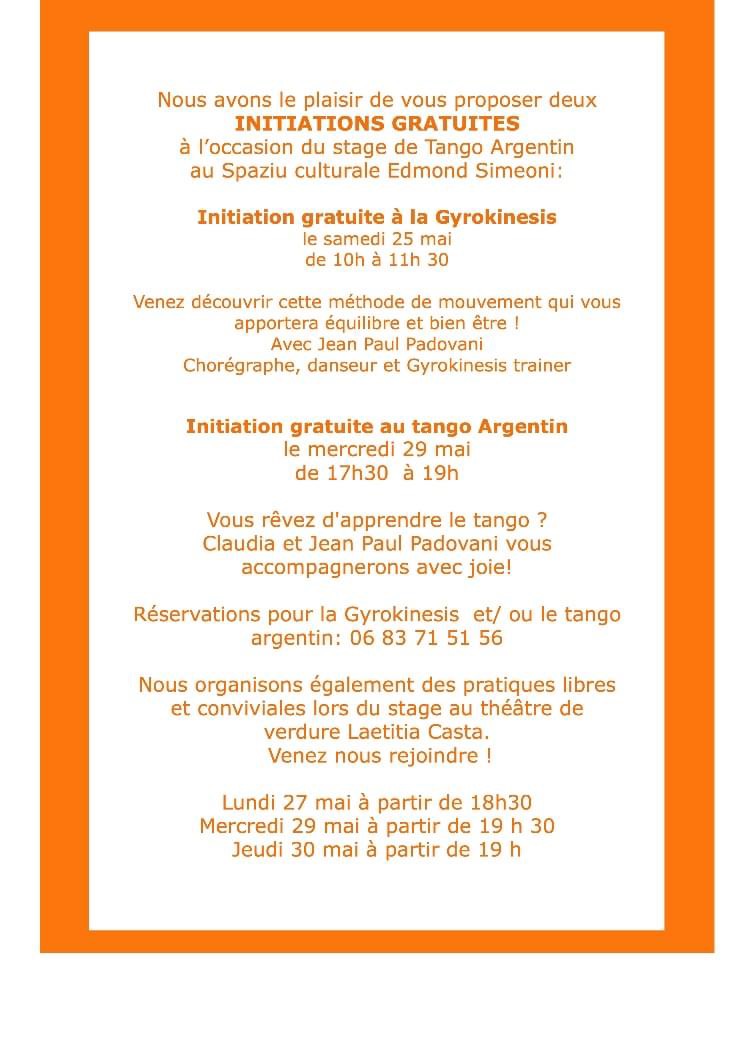 du 25 au 30 mai Spaziu culturale Edmond Simeoni - Lumiu Le stage de tango argentin revient pour sa seconde édition, et est prévue du 25 au 31 mai 2024 au Spaziu culturale Edmond Simeoni. Claudia et Jean Paul PADOVANI vous proposent de découvrir la Gyrokinesis et le tango argentin les : - SAMEDI 25 MAI de 10h à 11h30 pour une initiation gratuite à la Gyrokinesis - MERCREDI 29 MAI de 17h30 à 19h00 pour une initiation gratuite au tango argentin Pour vous inscrire, merci de contacter Monsieur PADOVANI Jean Paul au 06.83.71.51.56 Plus d'infos sur le site ou par téléphone. Programme en PJ. |