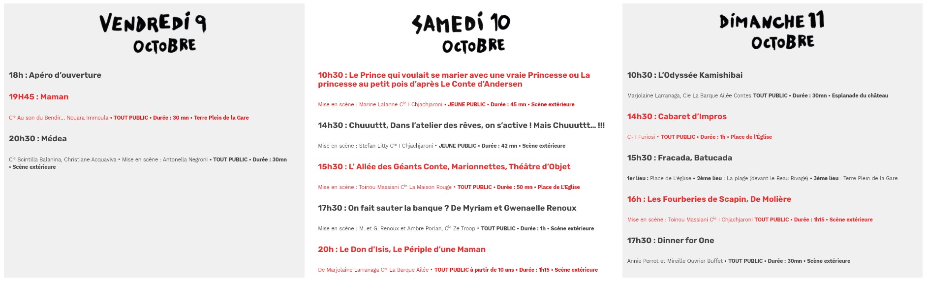 9, 10, 11 Octobre - Algajola L’A.F.C Algajola et la compagnie I Luminelli vous accueille pour cette 5ème Edition du festival de théâtre à Algajola En plein air Port du masque obligatoire Spectacles jeune et tout public Programmation en téléchargement. Plus d'infos sur le site. |