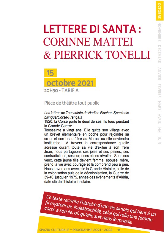 Vendredi 15 Octobre - 20H30 Spaziu Culturale Carlu Rocchi - Biguglia Plus d'infos en téléchargement. |