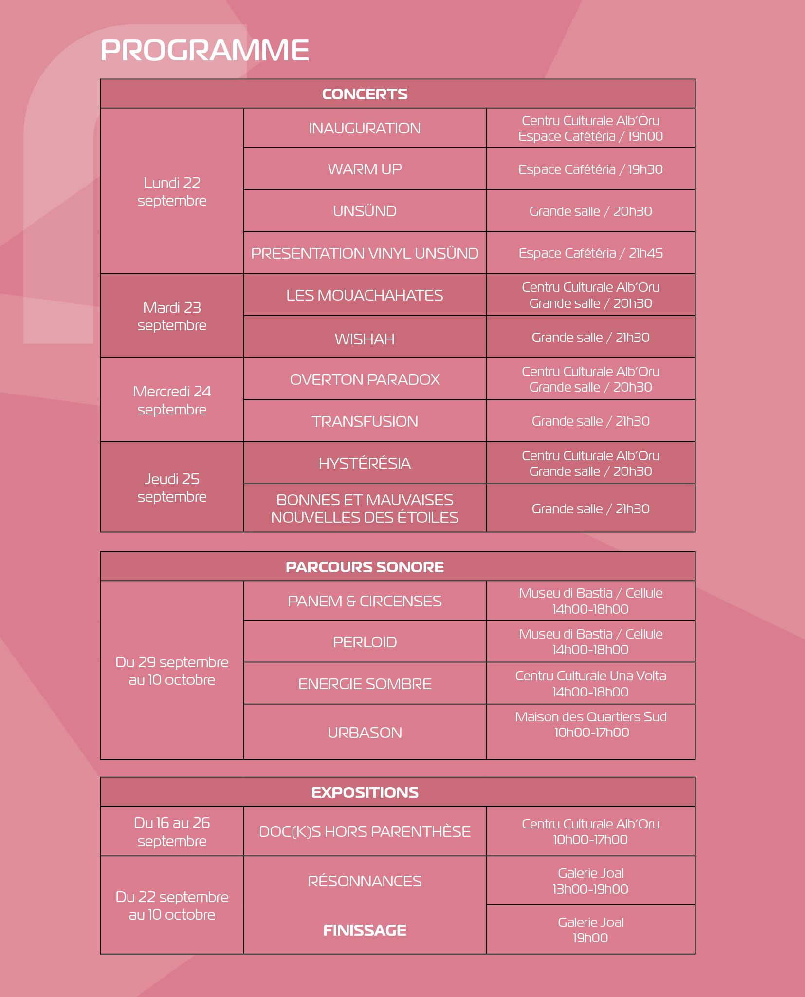 Du 22 septembre au 10 octobre Centru Culturale Alb'Oru / Centru Culturale Una Volta / Museu di Bastia / Maison des Quartiers Sud / Galerie Joal - Bastia Concerts, performances, installations sonores et expositions Plateforme des musiques de création et de toutes les expérimentations sonores. Programme en téléchargement Plus d'infos sur le site |