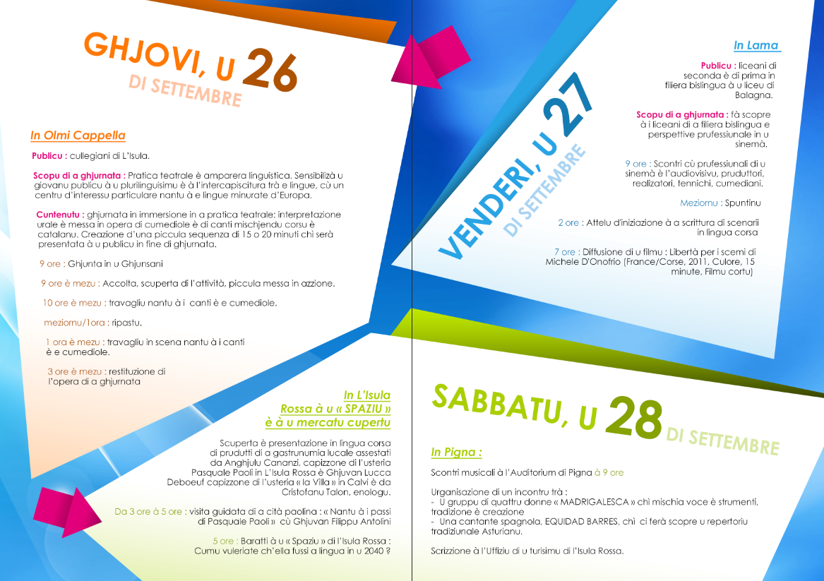 À 5 ore: Scambiu à « U Spaziu » di l’Isula Rossa « Cumu vuleriate ch’ella fussi a lingua in u 2040 ? », animatu da Petru Mari. Serà u primu appuntamentu di i scontri urganizati per l'appruntera di a nova pianificazione Lingua 2020.